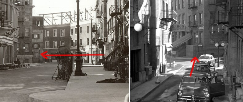 I could tell those exteriors of Garsell’s apartment were shot on a studio backlot, and since this film was released by MGM, I searched old photos of the lot to see if I could find anything that looked the same. I eventually found one hi-res image that seemed to show one the buildings that appeared at the end of the narrow street the apartment was on.