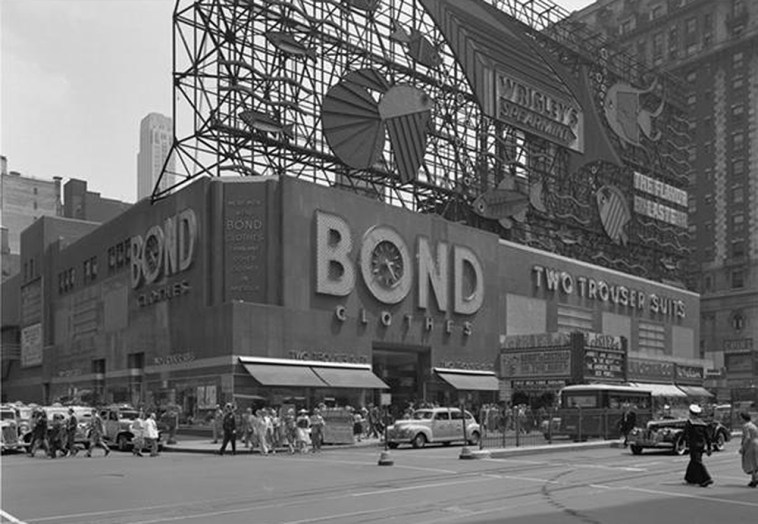 Whenever I track down old movie locations that took place in Times Square, the results are inevitably disappointing because things have changed so much there over the years. The majority of the old buildings have either been torn down or they’ve been altered so dramatically, they’re practically unrecognizable today. A perfect example is the Bond Clothing Store on the east side of Broadway between 44th and 45th Streets, whose building is still there, but looks nothing like it did fifty-sixty years ago when it was the centerpiece of the Square.