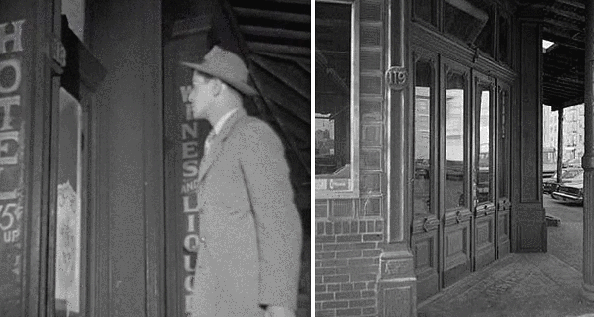 Once I went to the building in person, I found another plaque where the Meyer’s Hotel entrance used to be, and it had the number 118 —the same number in the film— making me confident that that is where they shot this scene.