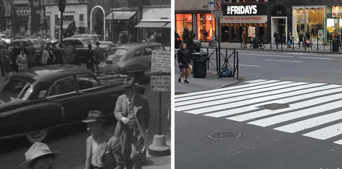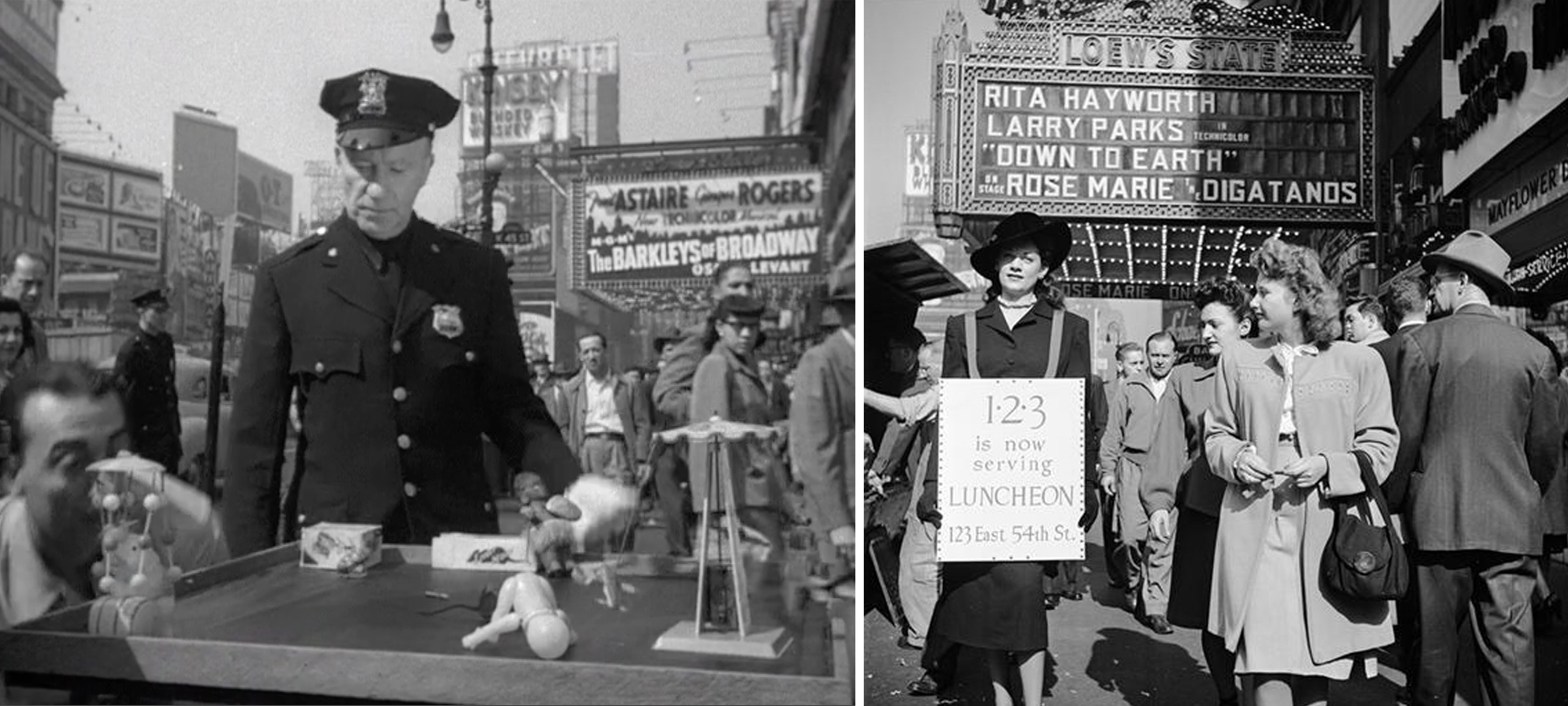 Even though the Times Square of today looks nothing like what it did when they filmed this scene in 1949, if you look closely at the “before/after” image above, you can see one extant building in the background that is remarkably unchanged. It’s the Brill Building (est. 1931), the striking Art Deco edifice located at 1619 Broadway, which appears in this scene in the far background, directly between the policeman and the street peddler. (The building was also prominently featured in the 1957 film, Sweet Smell of Success.)