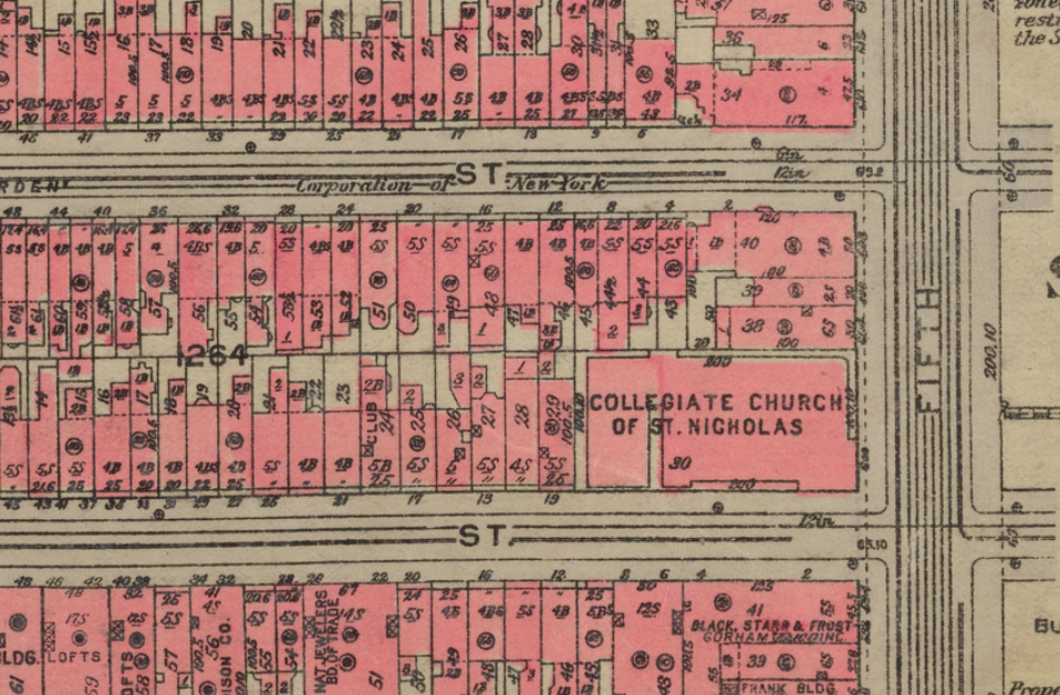 Modern street views on Google didn’t show any corner churches that matched the one in the film, so I checked the 1930 land book to see if there were any corner churches on Fifth Avenue that have since been removed. After looking through several pages, I came across “Collegiate Church of St. Nicholas” on Fifth and 48th. As promising as that looked, the one thing that temporarily puzzled me was the fact that the church was on a block that is currently occupied by Rockefeller Center, and I was pretty sure Rockefeller Center was already built by 1949.