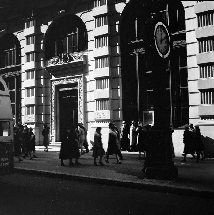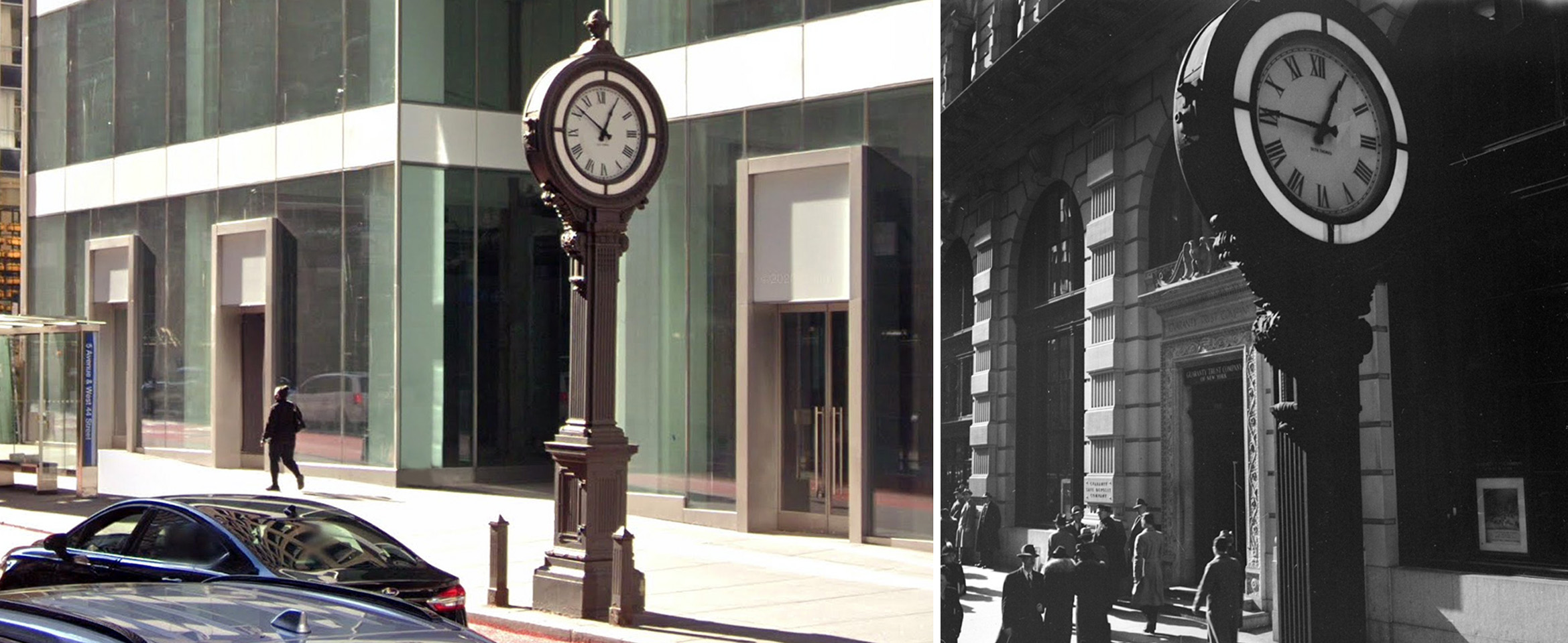 Manufactured in 1907 by the Seth Thomas Company, the large an art-deco black-and-white clock originally stood on Fifth Avenue and 43rd Street in front of the American Trust Company. But in the 1930s, it was moved one block north to its current location, in front of what was colloquially known as the Guaranty Trust Company building.