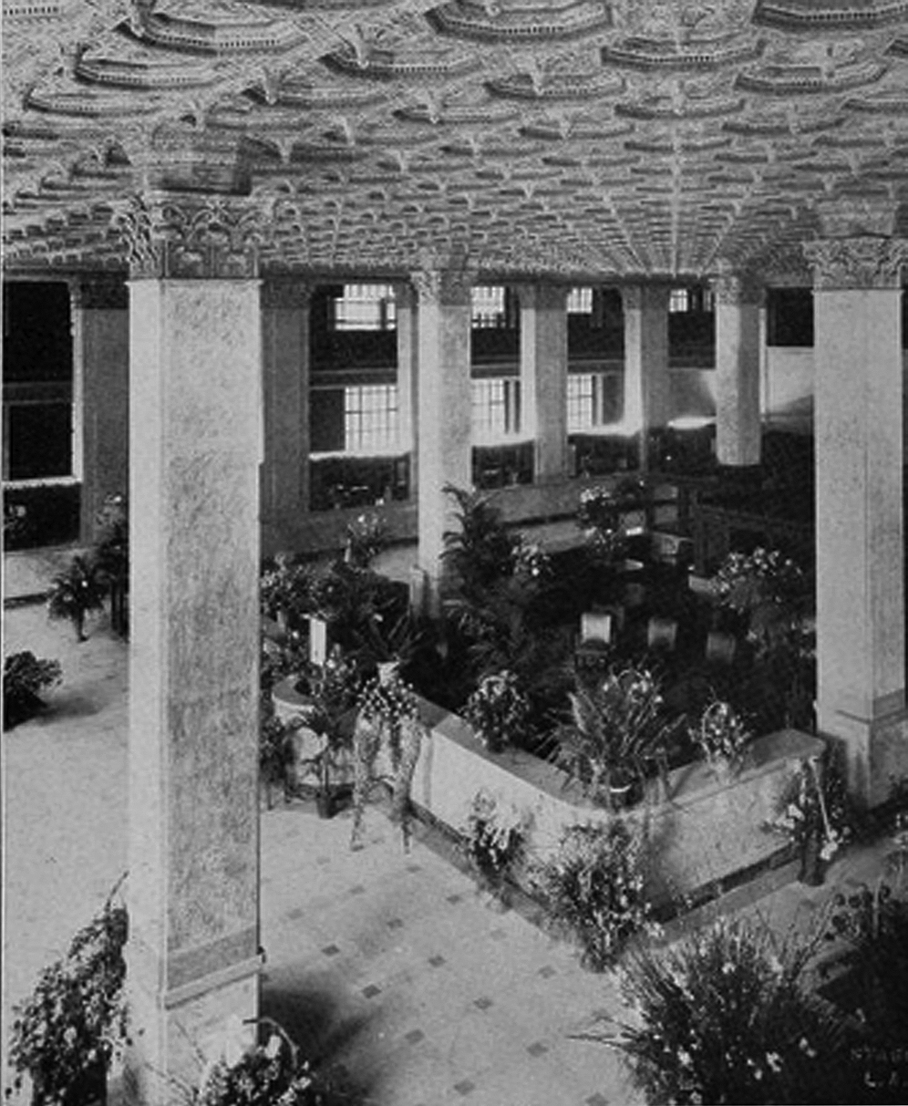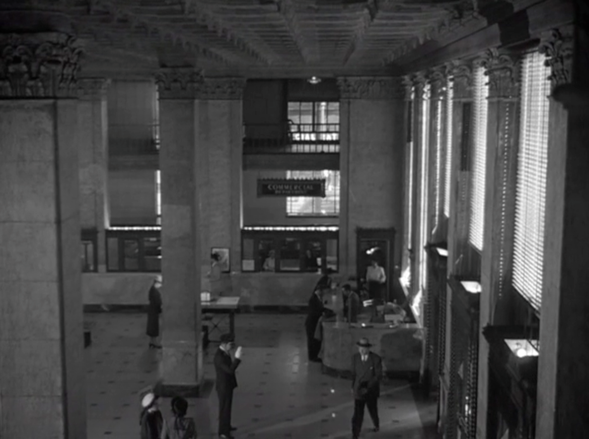 That led me to do an online image search for “banks in Los Angeles,” to see if I could find the one used in the film. When I did this image search, I adjusted the settings to give only black-and-white results (a good tool to use if you’re trying to narrow your results to pre-1970’s) and found one image of the Pacific Southwest Trust and Savings Bank which had a similar-looking ornate lobby with square posts and an intricate coffered ceiling.