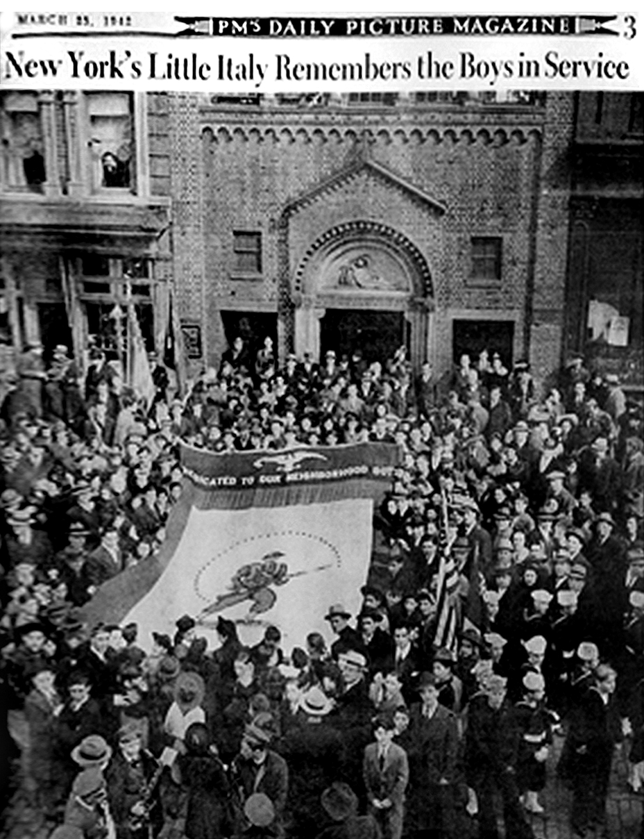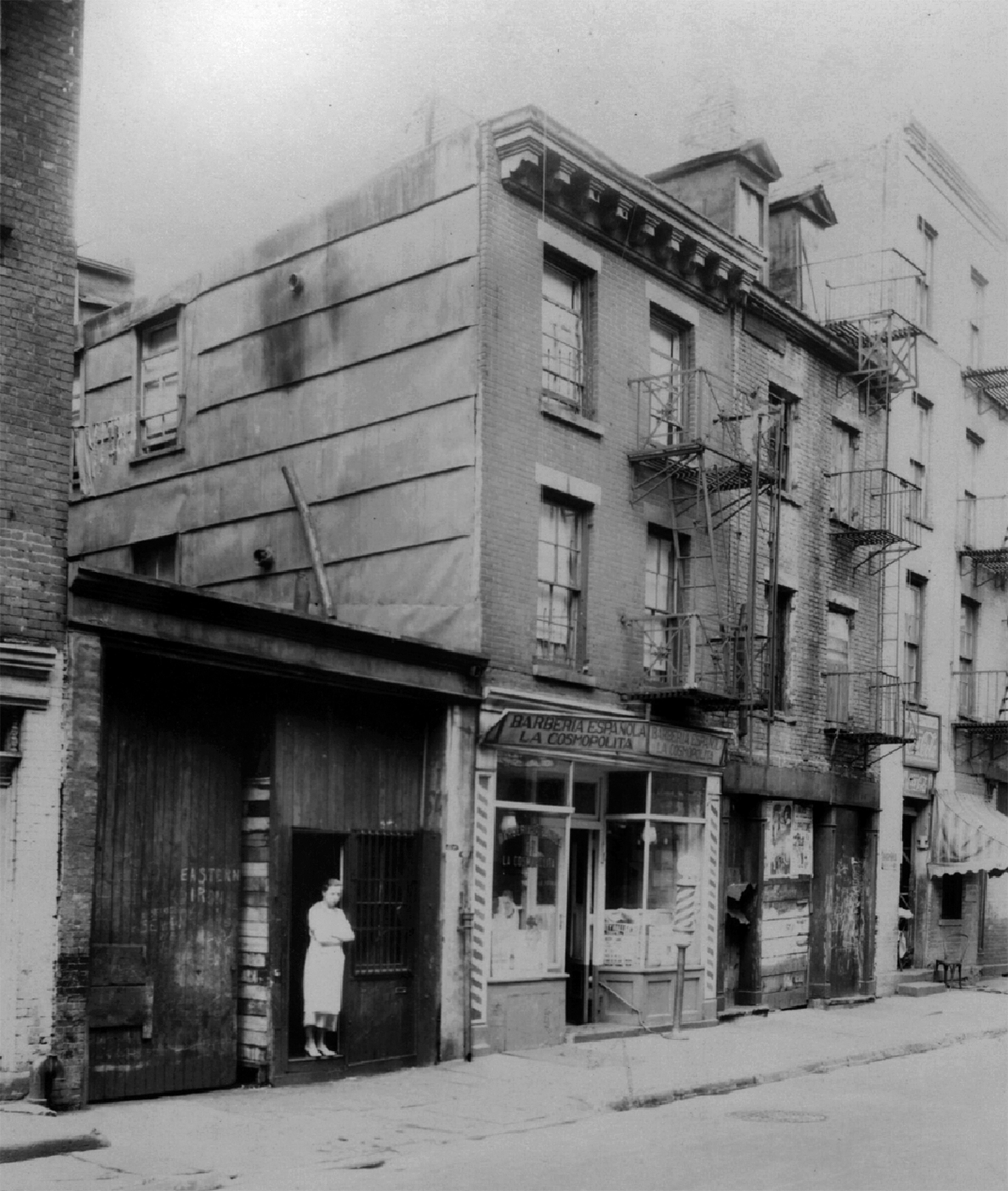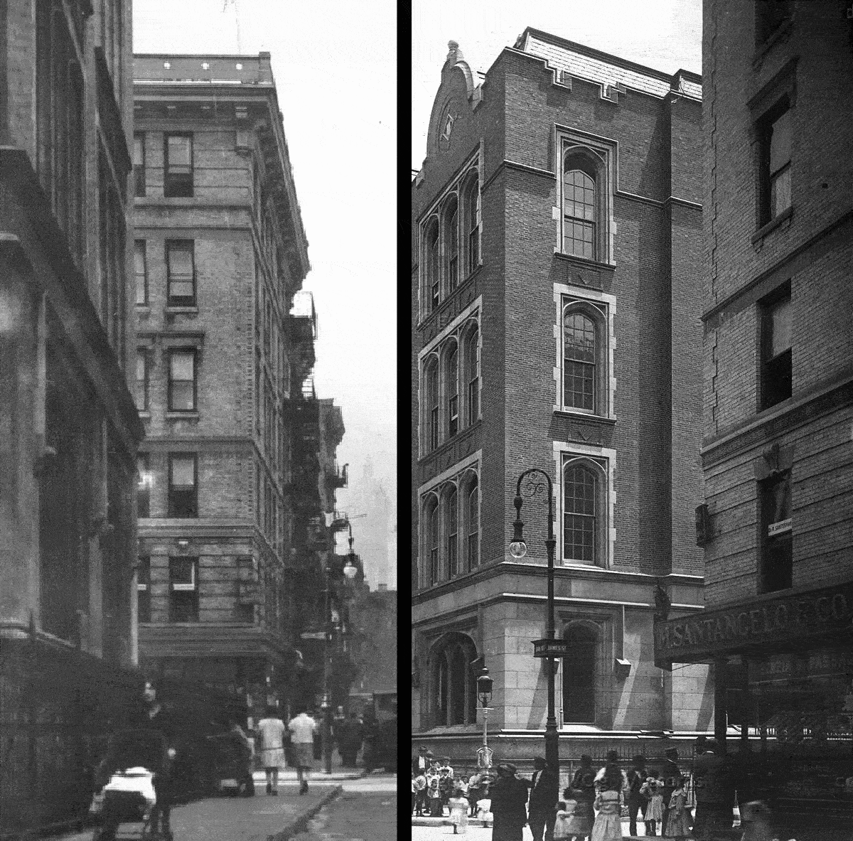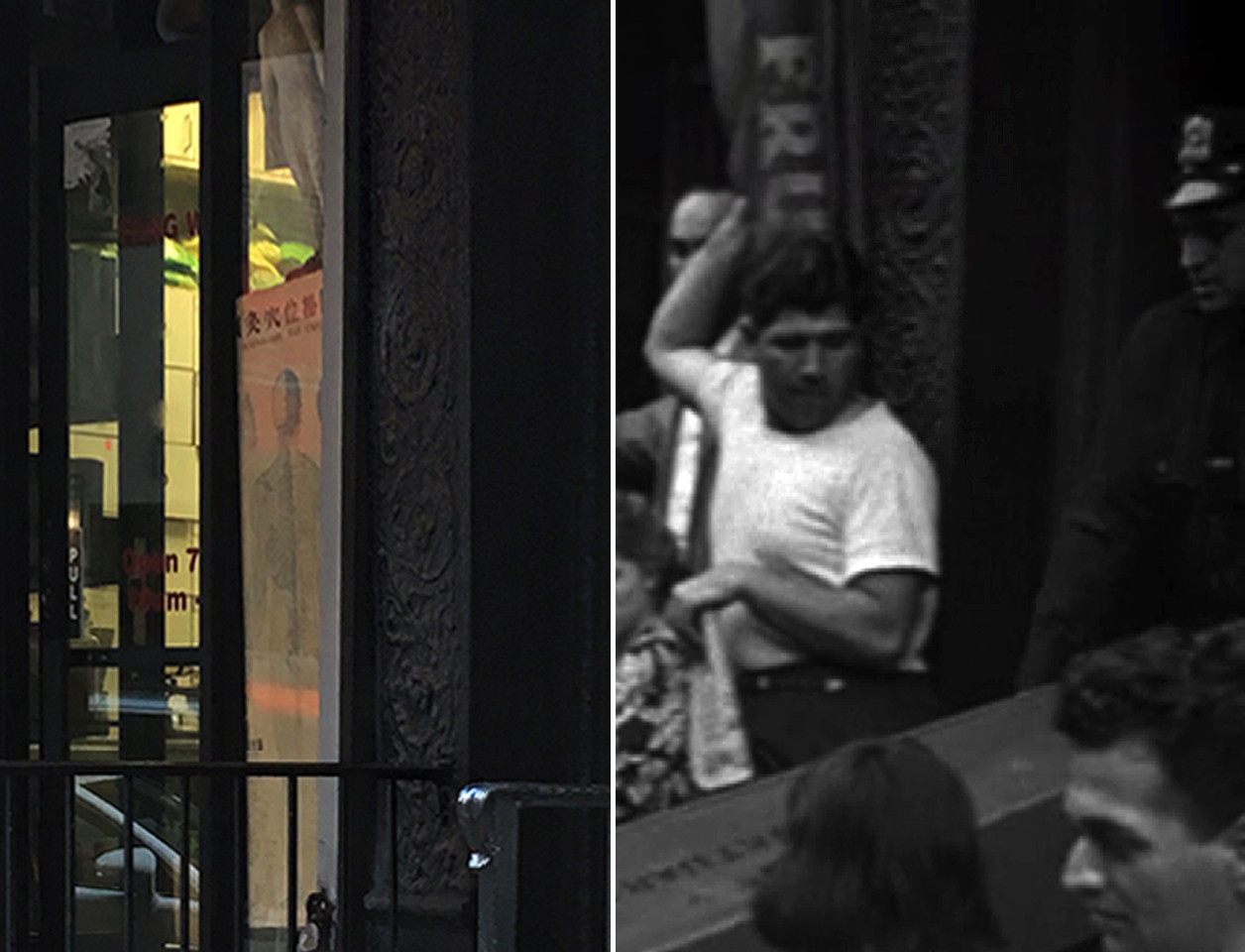 Blakeslee found this location on a hunch. He could see the collapsed awning on the left side of the frame had on it the word, “CAFFE” (Italian for coffee), leading him to believe that this scene took place somewhere in Little Italy. So he did some poking around the neighborhood until he found a match with the Chapel of San Lorenzo Ruiz on Broome Street (formerly the Church of the Most Holy Crucifix).