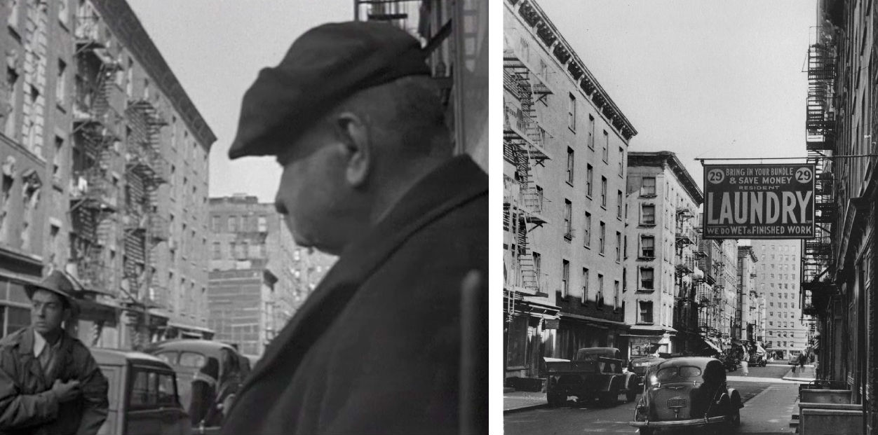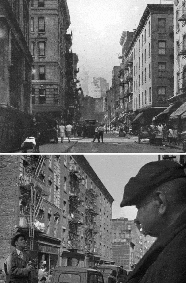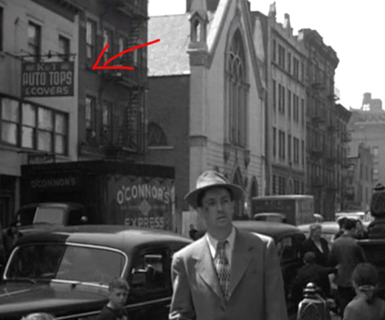 After studying the scene, Blakeslee thought the awning at the top right corner of the frame said “AVE C FISH MARKET.” And since the awning below that had the number 70 on it, we deduced the scene took place at 70 Avenue C in the East Village (which was considered the “Lower East Side” in 1949 when this film was being made).