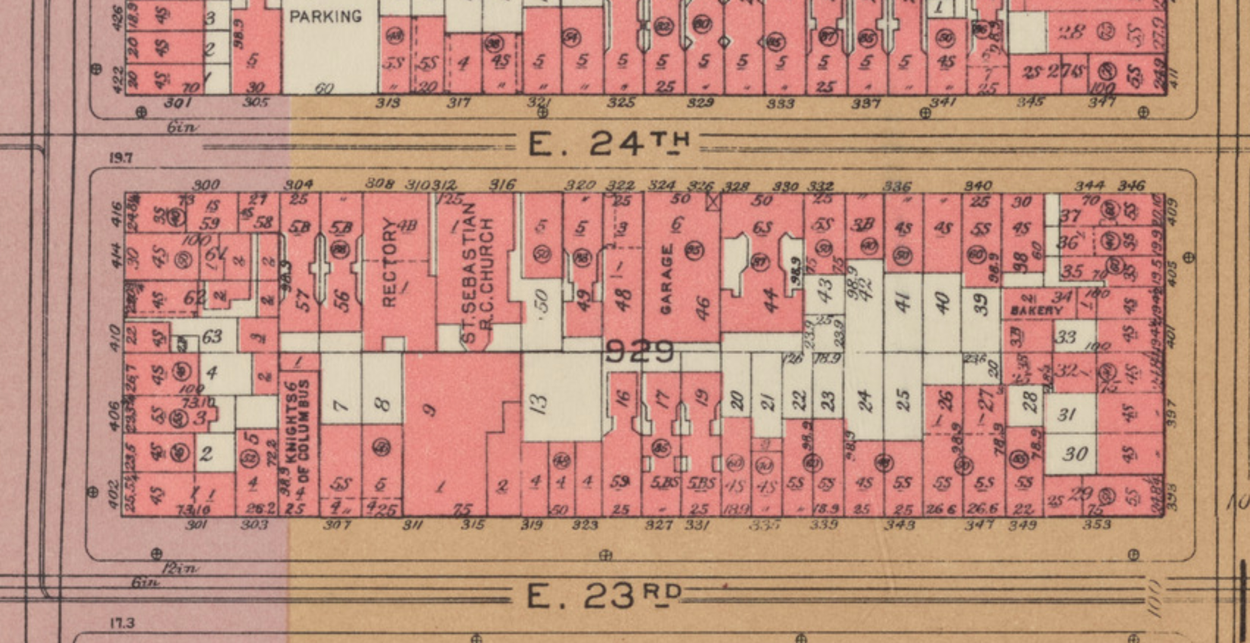 Then, when I consulted a 1955 map of that area, I noticed that one of the lots on E 24th Street was marked as Saint Sebastian Roman Catholic Church, which I thought might be the same church that appeared in the scene to the right of K&T Auto Tops.
