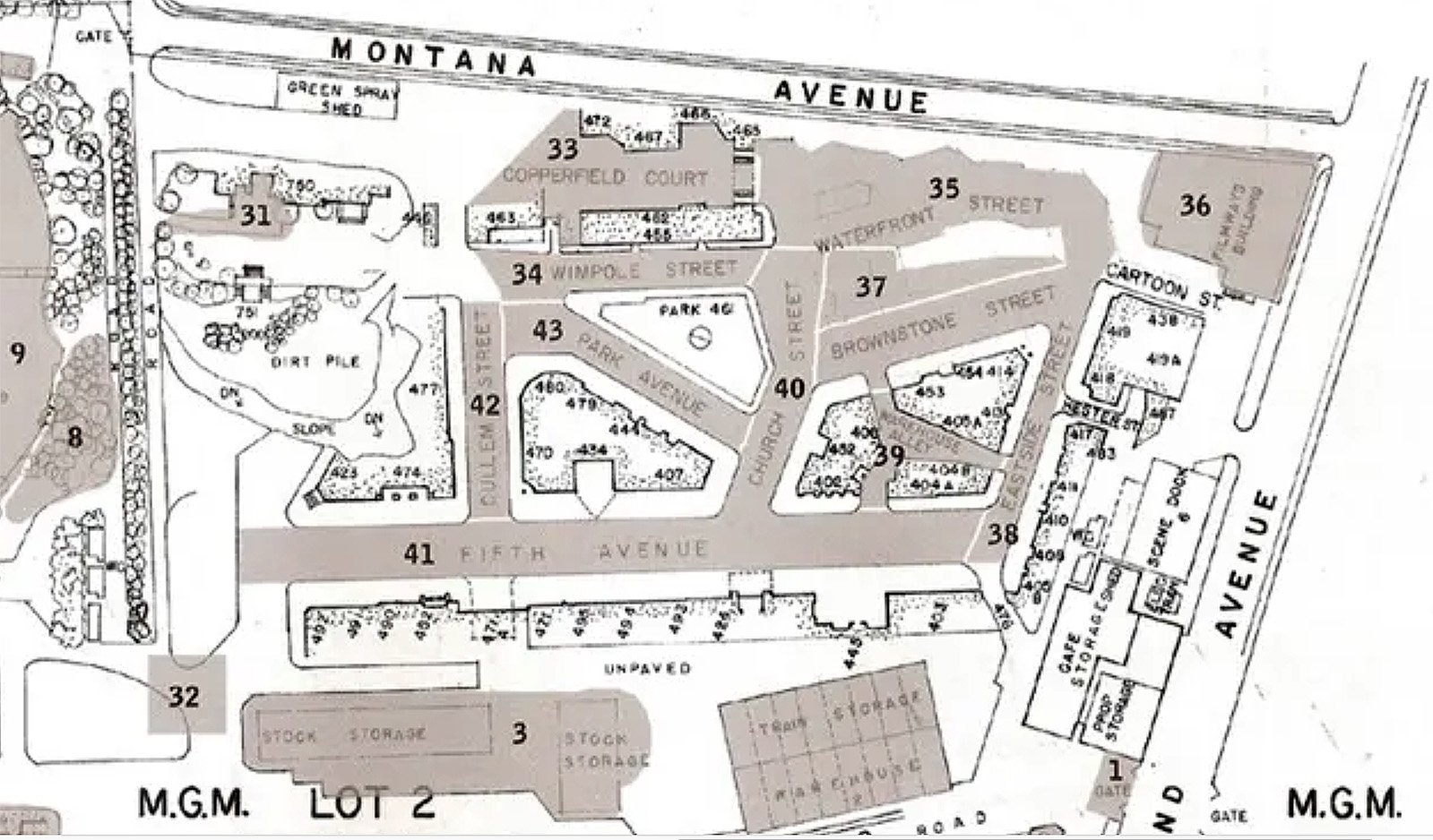 I could tell those exteriors of Garsell’s apartment were shot on a studio backlot, and since this film was released by MGM, I searched old photos of the lot to see if I could find anything that looked the same. I eventually found one hi-res image that seemed to show one the buildings that appeared at the end of the narrow street the apartment was on.