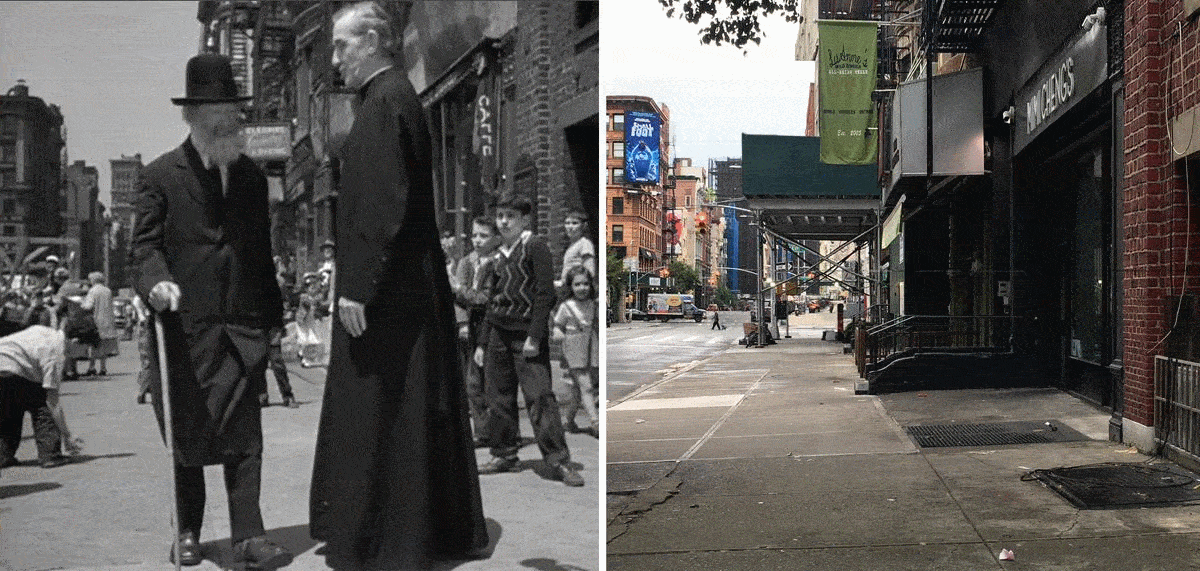 To help confirm this, I tracked down a 1926 photograph of Avenue C on the NYPL Digital Archives and found several details that seemed to match the film. The thing that stood out the most in that photograph was the corner building at 90 Avenue C with its noticeable lack of windows on the south-facing wall. making me fairly certain we found the correct spot.