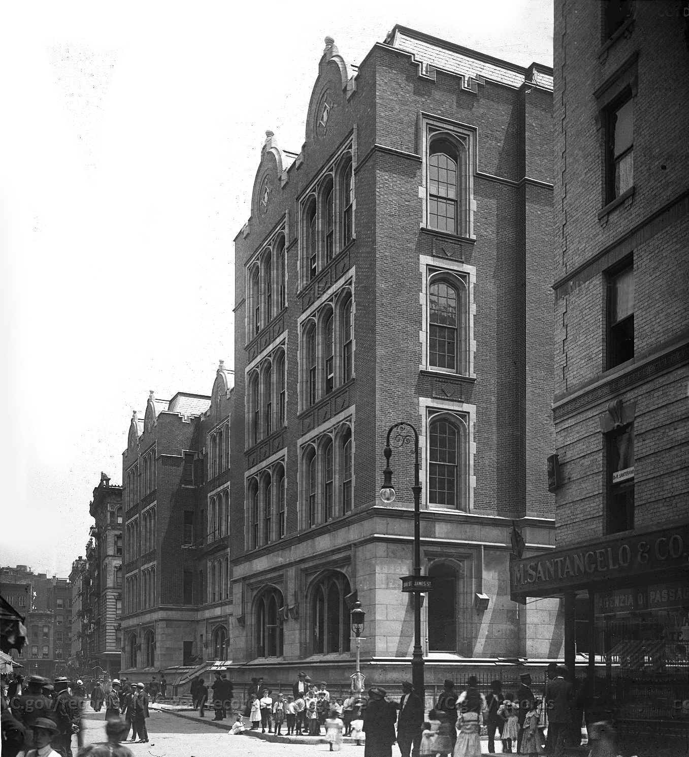 Right around this time, Blakeslee was looking through the NYC Municipal Archives and stumbled upon a wonderful high-resolution photo from 1902 of a public school building. Luckily, the photo featured a clearly-marked street sign (whose marvelous design was something I had never seen before), indicating we were on Oak Street looking towards James.