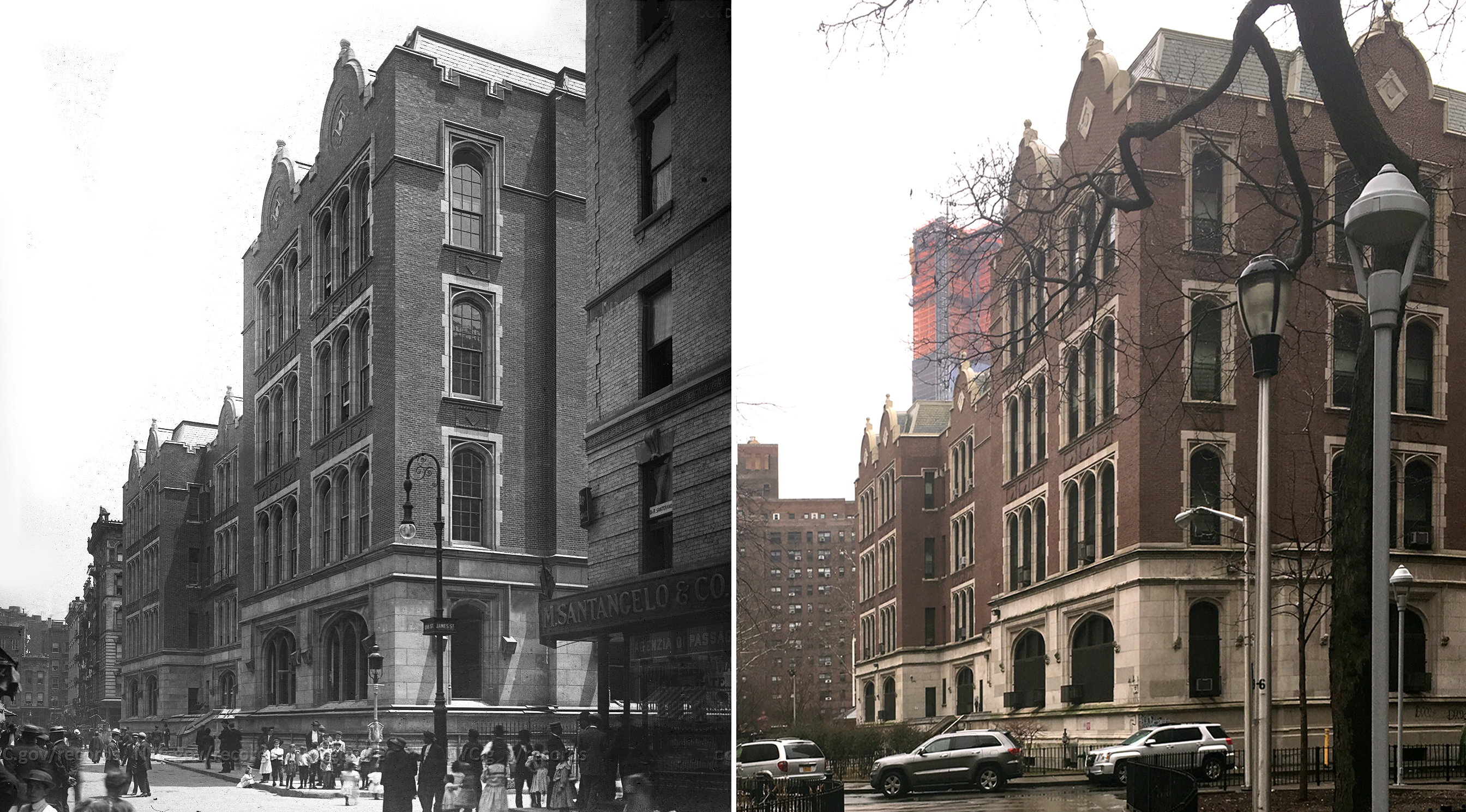 Standing in the middle of the Alfred Smith housing complex, I was trying to get my bearings so I could take a picture that was as close to the actual filming site as possible, but I quickly got lost in a jumble of identical giant residential buildings. As I tried to figure out which way to point my camera, I suddenly came upon a landmark I hadn’t expected to see — the public school building from that 1902 photo!