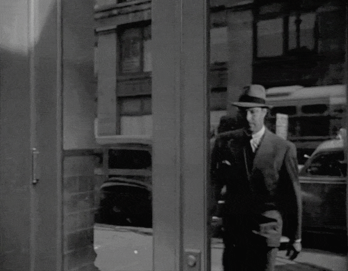 But then I spotted something peculiar about an early bank scene that made me rethink where they shot the interiors. At the beginning of the film, when the blackmail victim enters the building, the actor was evidently in front of a rear-projection screen, which meant they probably shot it on a soundstage in Hollywood. With that in mind, I rewatched a later scene that took place in an alley with actor Whit Bissell, who played the bank clerk, and that looked like it had also been done in Hollywood. That made me think that all the scenes involving Bissell were shot on the west coast, including the bank interior.