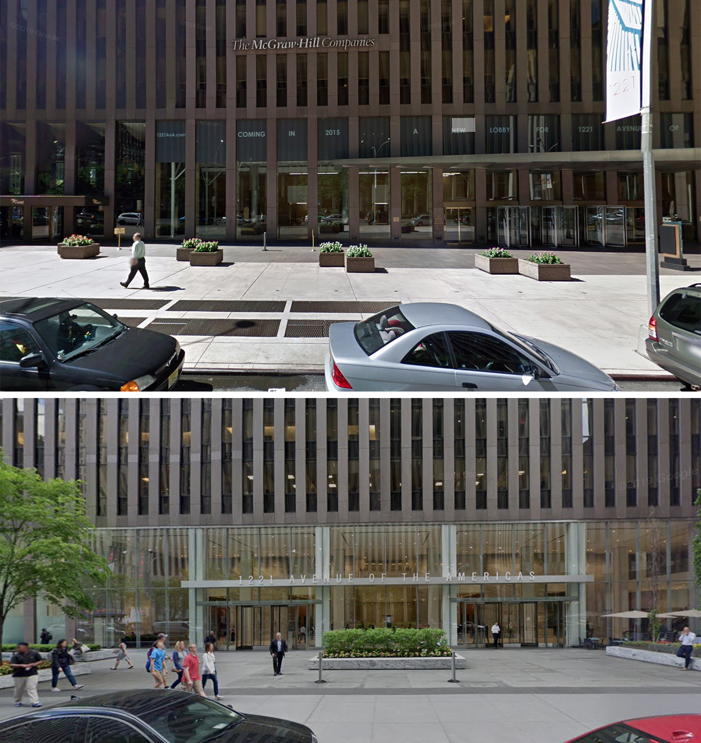 Even after searching all the blocks near Rockefeller Center in Google Street View, I couldn’t find anything that matched. So, I asked Blakeslee if he could take a look, and before I knew it, he found a winner with the nearby building at 1221 Sixth Avenue.