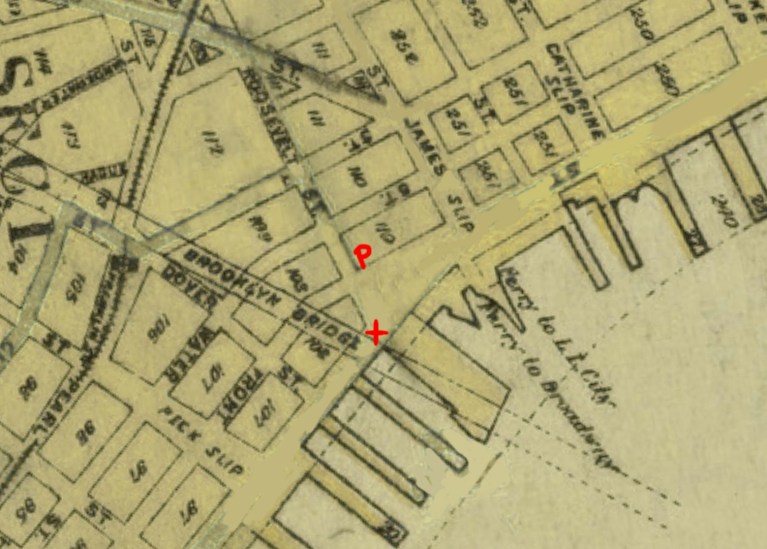 Of course, the entire area got razed in the 1950s to make way for the enormous Alfred E Smith Housing Development (which I assume was named to commemorate his birth-home at nearby 174 South Street), so we had to rely on vintage maps and photographs to figure this location out.
