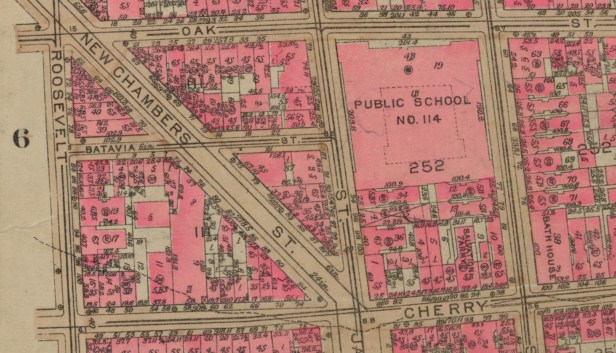 Blakeslee and I quickly zeroed in on New Chambers Street because it went on a diagonal, creating triangular blocks. As a helpful aid, the maps from the old Bromley’s land books include the heights of all the buildings, expressed in stories. So, we looked for any blocks that had buildings with the same combination of heights as the ones seen in the film, eventually focusing on an area near Cherry Street, which looked like it could be a match.