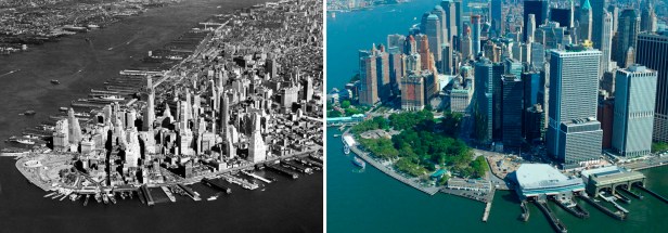 What’s nice is in the last “before/after” image above, you can still see a lot of the same buildings that appeared in this scene, since Battery Park affords an open, unobstructed view. Another interesting thing is that you can get a sense of how much wider the southern tip of Manhattan got after Battery Park City was added to the west side of it.
