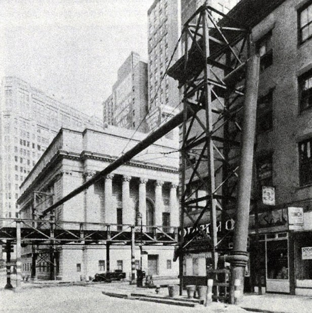 Thinking he was onto something, I did a little research into what might have been under construction in 1927 and discovered that the Eighth Avenue IND subway was being built at that time. Armed with that information, we were able to find a couple pictures of the IND being worked on, which showed more of those gas lines stretched above the street, giving a similar appearance to what was in this scene.