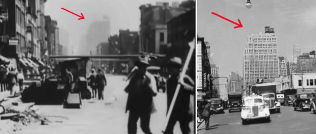 That’s when Blakeslee took the reins and looked through loads of vintage photos of Eighth Avenue, looking for something that matched the scene. The first thing he found was a 1932 image looking north on Eighth from around 22nd Street, featuring a prominent office building at 322 8th Avenue (est. 1925), which seemed to match the faint distant building in the film.