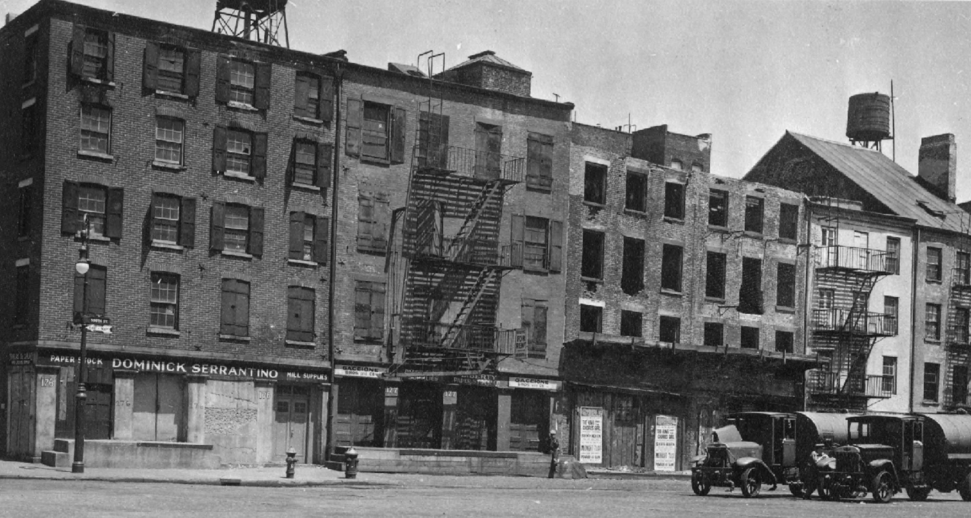 The first thing Blakeslee found was a photograph from the 1920s of 176-181 South Street which seemed to confirm we got the right address. While the Babino & Gatto paper maker signage was gone, the sign for Dominick Serrantino paper mill on the left building was still intact and seemed to match the film.