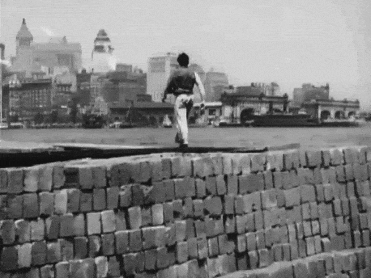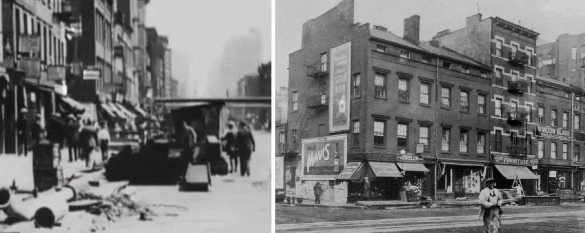 The block looked promising, and after going through the NYPL Digital Collection, I discovered a 1932 photograph of a three-way intersection of New Chambers, Cherry and James Street that was a match. Amazingly, it was taken at almost the exact same angle as the film, giving us definitive proof of the location used.