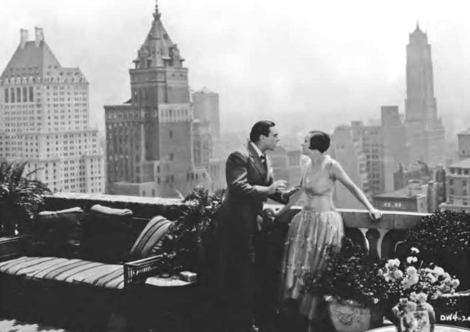 The fact Allan Dwan was integrating 1927 news footage into a film that was being released that same year shows how fast and nimble of a director he was. By bringing current events into the story —like the Lindbergh footage in this scene and an image of the newly-constructed New York Telephone Building in an earlier scene— he undoubtedly made the film feel more fresh and contemporary to audiences. Another example of this is in the last scene of the film which features a skyscraper that was a big news story only a few months before East Side, West Side was released to theaters. (See “On a Balcony” below.)