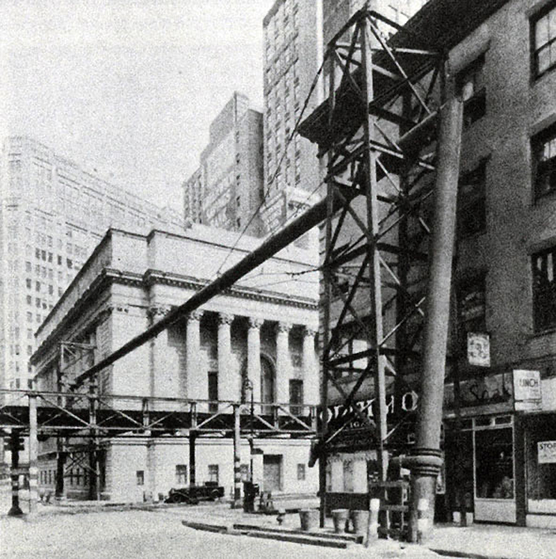 After sifting through ab bunch of old photos from that era, Blakelsee began thinking that what we were looking at might actually be construction gas lines. He came to this conclusion when he found a 1914 image of a subway line being built with gas lines being re-routed along wrought-iron bypass mains suspended above the street. This was done to avoid potential gas explosions when excavating the street, and from a distance, the larger mains looked like El tracks.