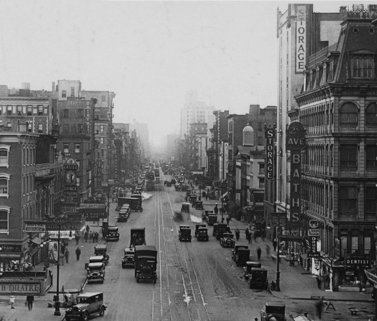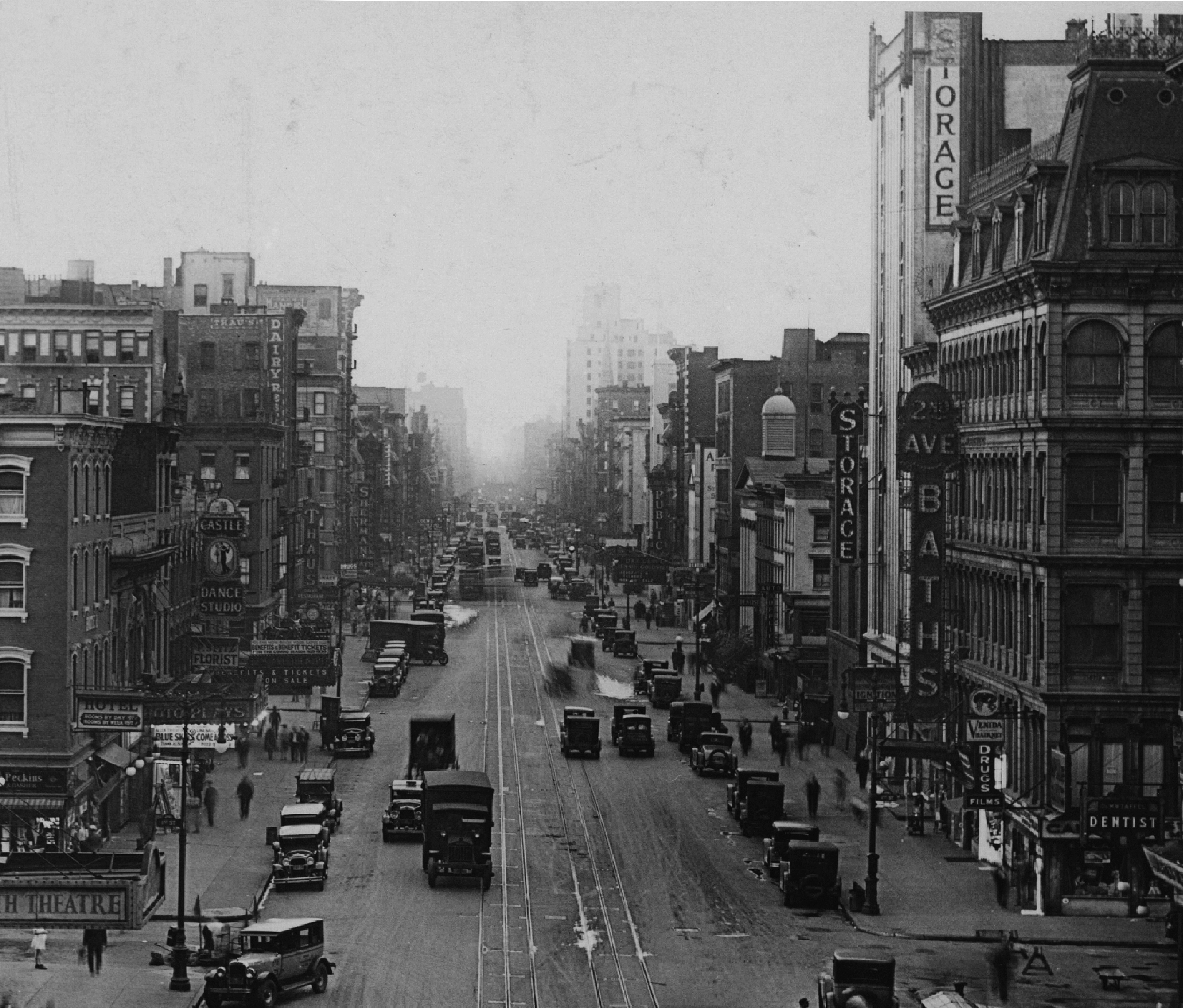 Looking north on Second Avenue, circa 1920s, with the prominent Second Avenue Baths sign on the side of the cast-iron building on the northeast corner of E 1st Street.