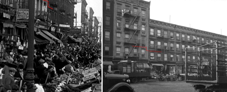 The second part of this opening scene was a little harder to figure out, and after I failed to find references/addresses to any of the legible retail signs in the scene, Blakeslee, to his credit, was able to decisively take the reins. With all the pushcarts and Italian signs, it looked like this scene could’ve taken place in Little Italy or the Lower East Side (in fact, IMDB and AFI list Little Italy as one of the filming locations), but it actually took place in East Harlem, which was the first and foremost Italian neighborhood in NYC. Blakeslee investigated this often-overlooked historic neighborhood after concluding that the scene was shot somewhere uptown. He came to that conclusion because the street was too wide to be in downtown’s Little Italy, and there was a lot of open sky in the frame, indicating that we were most likely somewhere uptown, away from any tall skyscrapers. So, he thought the old Italian neighborhood in East Harlem was a good place to start. Of course, the area has seen a lot of demolition and renovations since the 1940s, so he had to rely on vintage photos to help figure out the exact location. After finding a few promising leads, Blakeslee homed in on First Avenue. He then went to the 1940 tax archives and found what looked like matching buildings in a photo of the west side of First Avenue between 113th and 114th Streets.