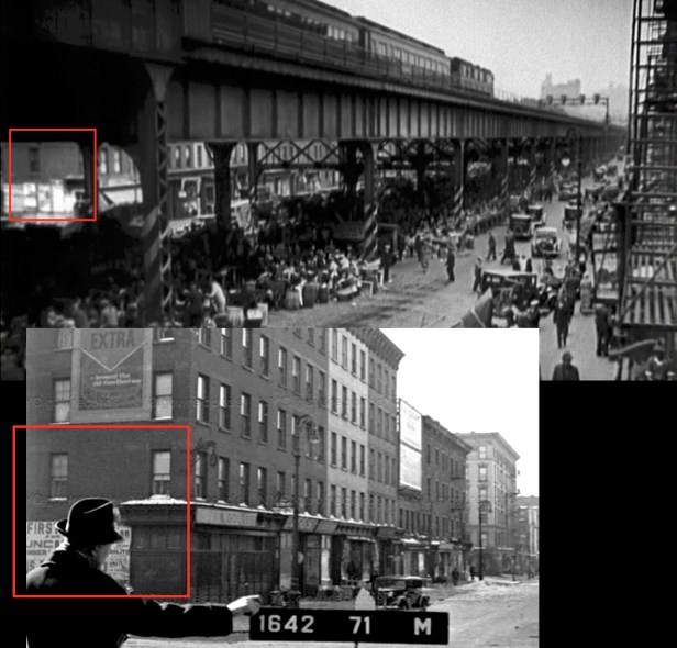 The opening shot from the film (top) and a ca 1940 tax photo looking at the east side of Park Avenue between 115th and 114th Streets (bottom). Red box shows matching details on corner building.