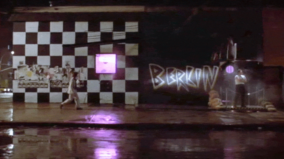 When I began researching this film back in 2015, the number one location I was interested in finding was this Berlin Club. It looked so much like the quintessential 1980s punk club — a place where I imagined expressionist painters and musical anarchists would congregate over shots of vodka. Even though I knew the building (if it was still around) would look very different from the movie, I was still keen to find it. At the time I was researching this film, I was still pretty new at finding locations, so it probably took me a little longer to find this place than it would today. The first thing I did was check out the corner of West Broadway and Grand, which was the address given in the note left by Kiki. But after looking at each of the corners at that intersection, I realized that none of them were correct. Later on, I thought that the former Don Hills night club on Spring and Greenwich might be the place, but after checking out the building, I rejected that idea. But fortunately, while I was in that neighborhood, I stumbled upon a nearby building on the corner of Hudson and Spring and realized that I had found the Berlin Club! The big clue that helped me identify it was the unique fire escape that ran along the side of the building like a catwalk (see the first “before/after” image above). Interestingly, even though the address in Kiki’s note was wrong, the address on a flyer that is later given to Paul in the diner was correct.