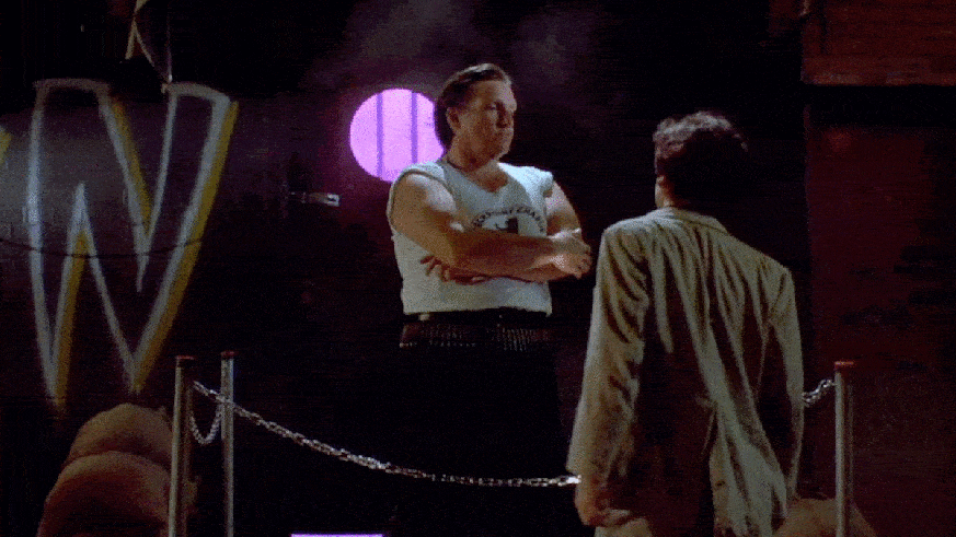 The bouncer informs him that since it’s “mohawk night,” if he had a mohawk, he’d be able to go in right away.