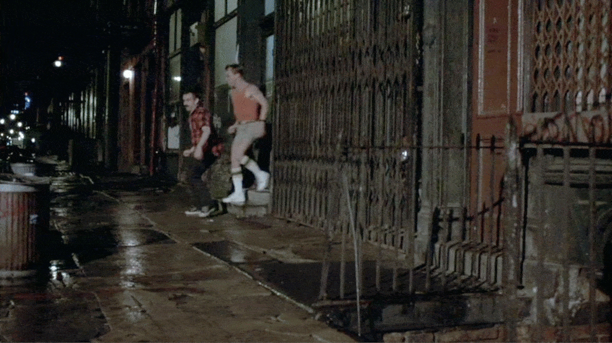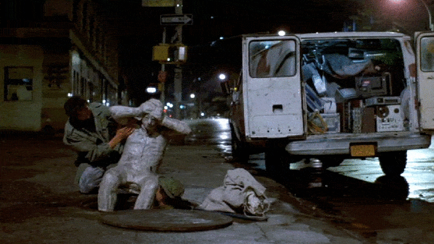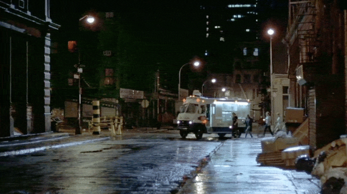 Had I been a little more experienced at researching film locations when I began working on After Hours, I would’ve found the location of the Berlin Club a lot sooner if I just paid attention to this later scene where the statue is being pulled out of the manhole. If you look closely in the background, you can see a street sign for Spring Street, which would have saved me a lot of time of looking at other possibilities.