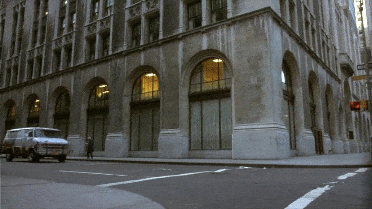 The action ends up jumping south one more time, as the van drives north on Madison Avenue and turns right onto E 25th Street (although set dressing put a fake “48th St” sign on the pole.
