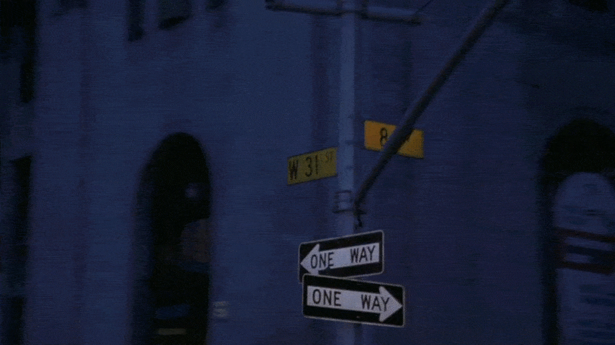 As the van drives uptown, we get glimpses of its progress through street signs, such as W 31st and 8th Avenue, near the James A. Farley Post Office.