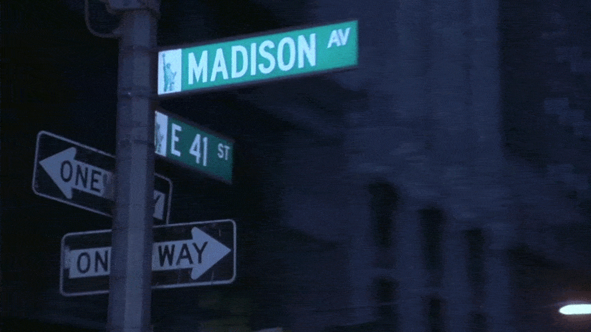 They also pass E 41st Street and Madison Avenue. (Notice that the street signs from this shot were green at the time, while the signs from the previous shot were still the old yellow design.)