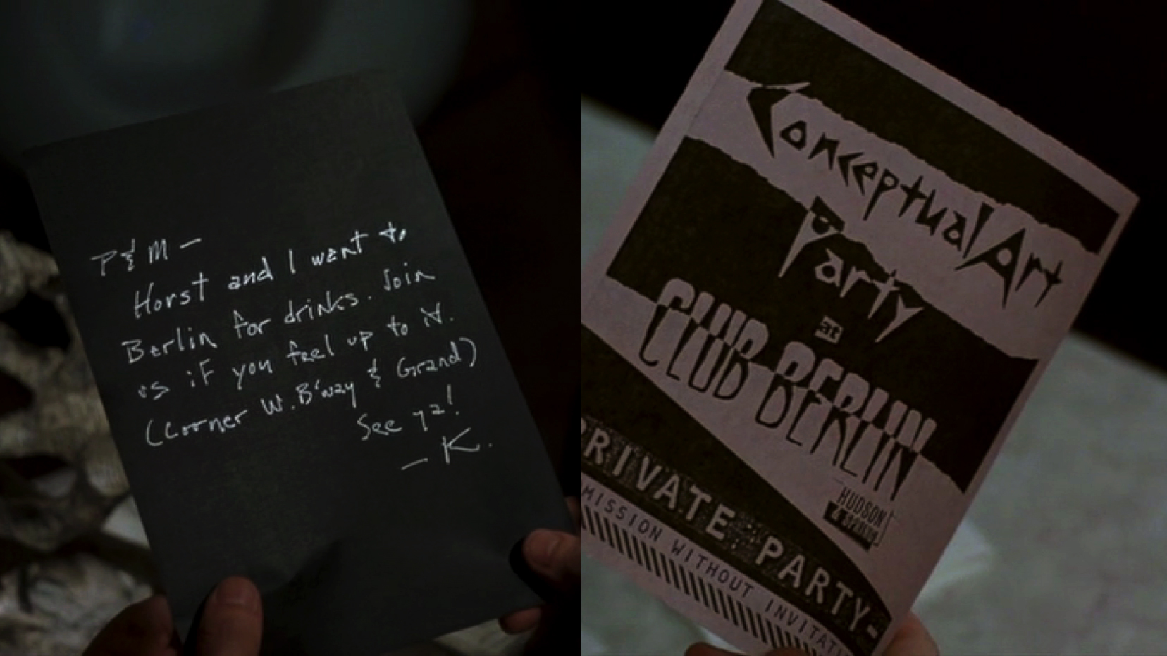 Stills from two different scenes from the movie, where conflicting addresses to the Berlin Club are given (the one on the right being correct).