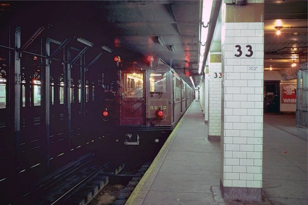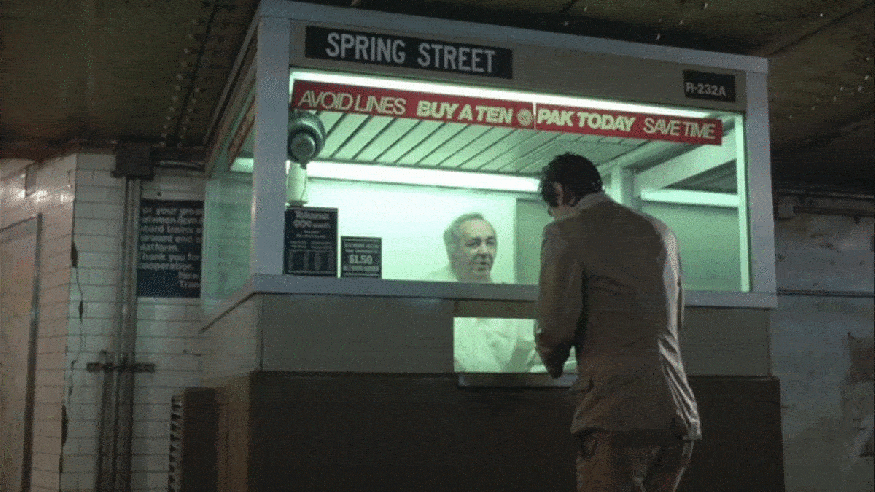 Given the signage that appears in this scene, I assumed it was shot at the Spring Street station in SoHo, but for the longest time, I thought it was the one on Sixth Avenue. However, when I studied the end of the scene more carefully, I realized that Paul actually exits the station on the other side of SoHo at Lafayette Street. It was hard to decipher any structures at first because of the heavy rain, but I was eventually able to identify some of the buildings on Spring Street confirming the location. (A side note about the rain, according to cinematographer Michael Ballhaus, because they were on a tight budget, the rain effect was accomplished simply by having crew members on the rooftops spraying the street with hoses.) At that point, I thought I had this location completely solved, until I discovered something else that had previously eluded me — the interior is not Spring Street at all. It is clearly a different station because you can see that production covered up the station name on the tiled columns, as well as the street name(s) on the large exit sign above the turnstiles. I eventually concluded the interiors were shot at the 33rd Street station for the IRT Lexington Avenue Line. The big clue that got me there was a small sign on the token booth that had a unique-looking code on it which read, R-232A. I already figured the Spring Street name and the $1.50 token price sign were set-dressing, but that R-code seemed cryptic enough that the crew wouldn’t bother changing it for the movie. However, when I did an online search for “R-232A,” nothing came up. That’s when Blakeslee took over, and with his uncanny Google-fu skills, he was able to find a website that listed all the token booth codes and the associated stations. His trick was doing a Google search without hyphens, which yielded him a couple hits. An interesting thing I discovered after looking at these websites was that not only did each station have a different code for their token booths, but each individual booth at every entrance had a different code from the others. This would indicate that this scene could have only been shot at one specific station entrances, and I’m pretty sure it’s the 32nd street entrance for the downtown local. Once I became fairly certain of the station used for the film, I went digging around for some vintage photos to further confirm my conclusion. I eventually found one from 1979 which featured the same white-tiled columns with a brown stripe on top that appeared in this scene.