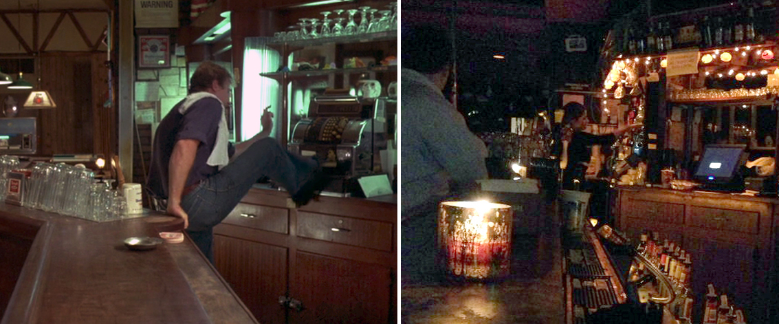 A still from the 1985 film (left), compared to a 2010 photo of the Emerald Pub with the matching backbar (right).
