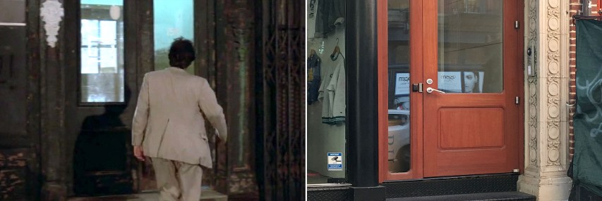 A couple years later, I decided to re-investigate the scene, just curious if it was actually shot somewhere else. That’s when I discovered garbage cans in the scene with the number 37 on them (see the third “before/after” image above). Knowing that Scorsese shot a lot of stuff on Crosby Street, I immediately went there and discovered that the building at number 35 was a match. (I was also delighted to discover that the fire hydrant near no. 37 is apparently the same one from 1984, which is kind of rare.) Shortly after that, I watched that behind-the-scenes featurette on the DVD and saw that the map used by the production team actually listed the bartender’s address as 35 Crosby Street, further confirming I found the right place.