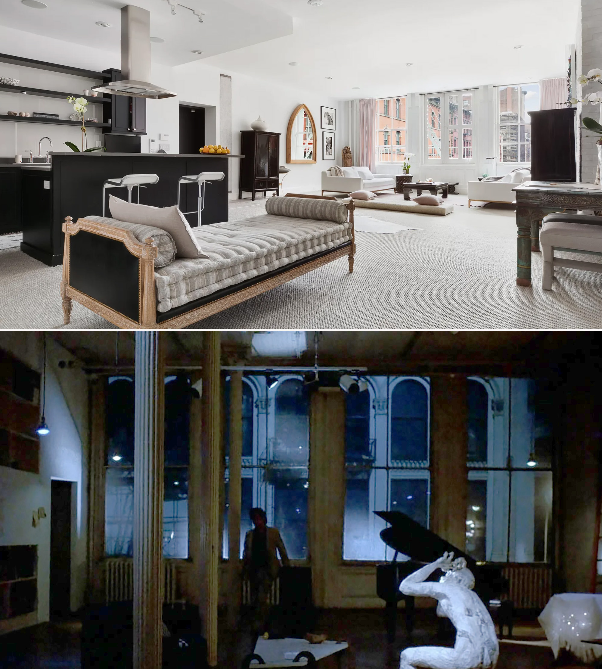 A modern view of apartment 4R at 27 Howard (top) compared to a still of Kiki’s apartment in the movie (bottom), which was certainly filmed someplace else.