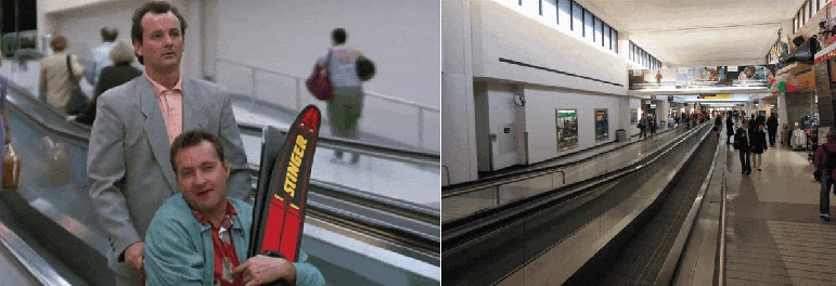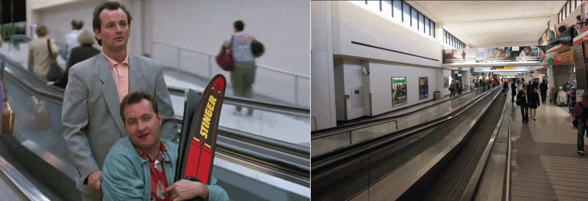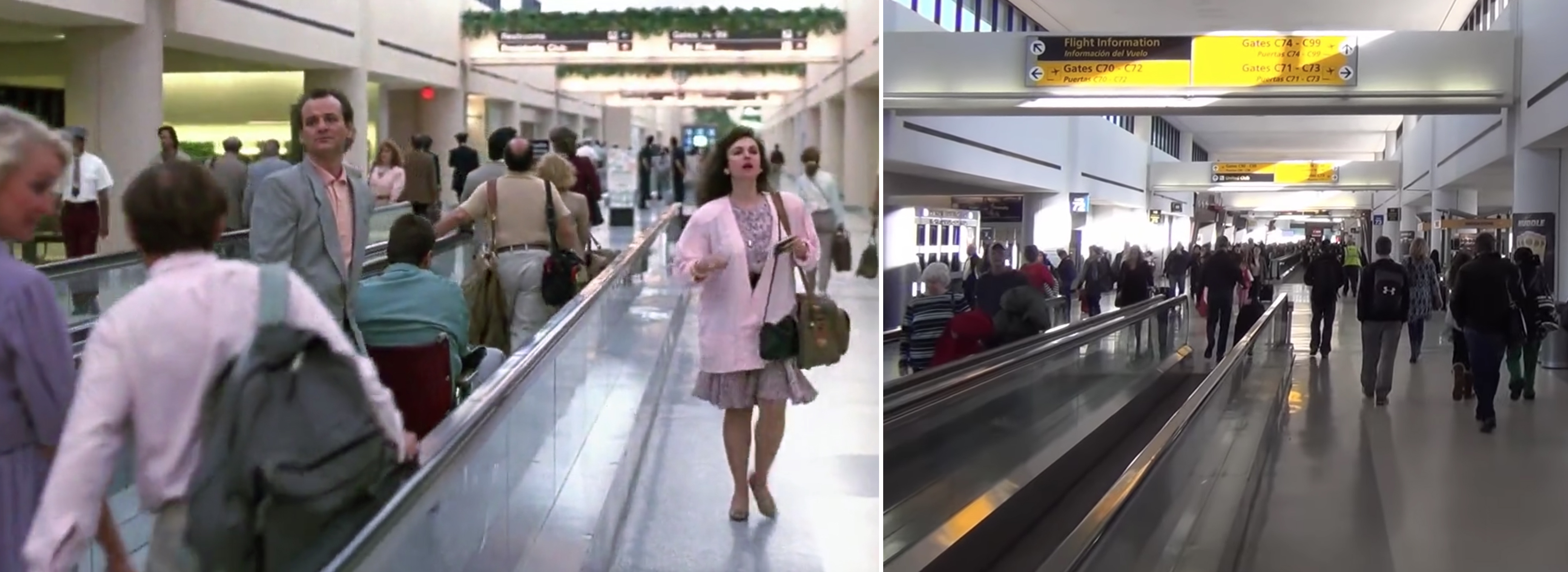 A still from the 1990 film (left) compared to a 2015 image of the corridor at Terminal C near Gate 70 (right), both featuring a moving walkway.
