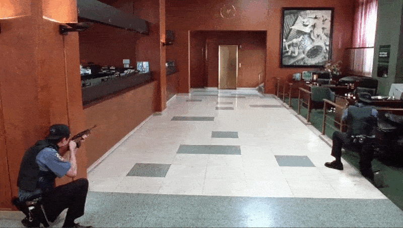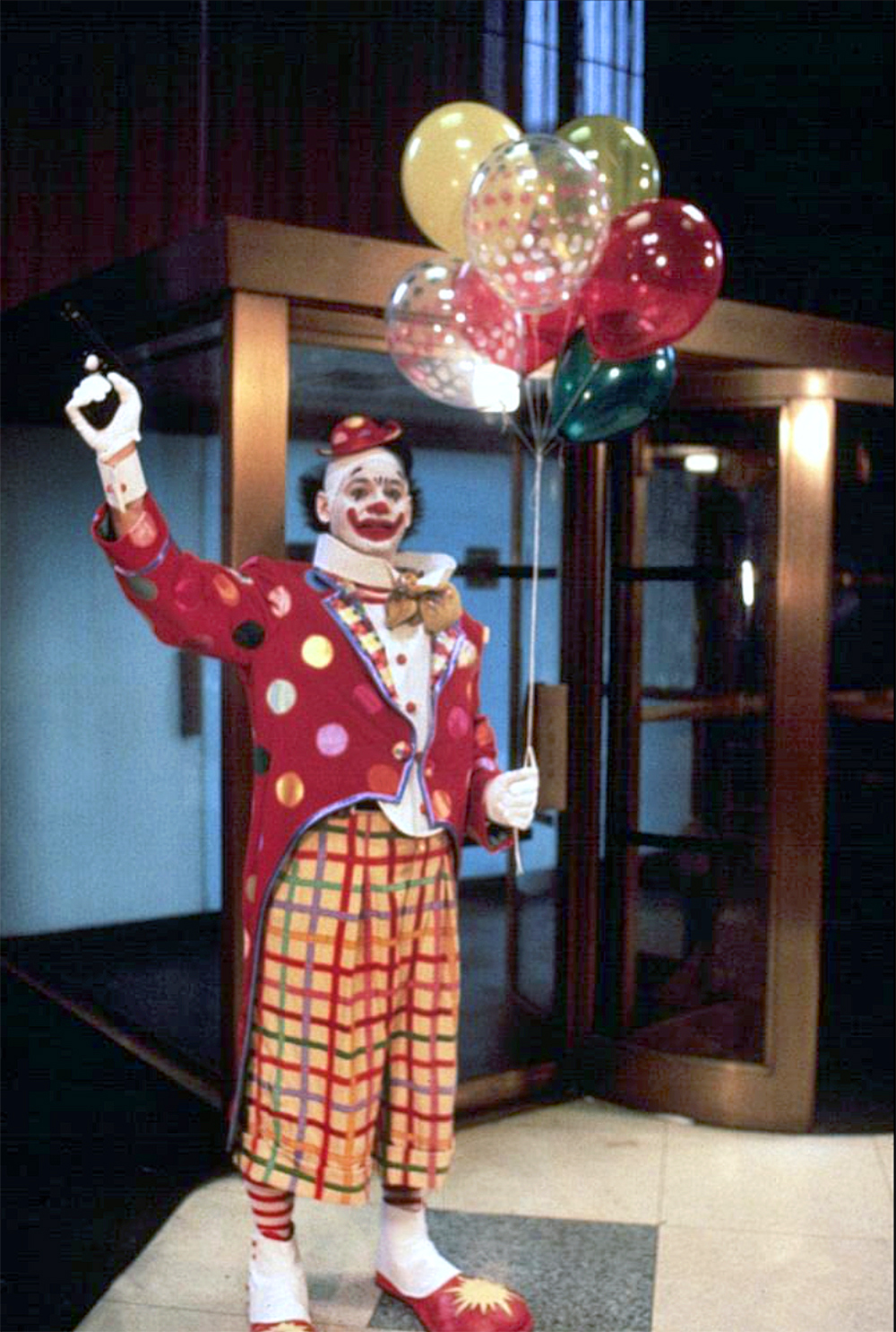 The front doors were frosted and the windows were covered with dark opaque drapes, blocking any clear views of the outside. These design choices could’ve been done to deliberately obscure any signs of the bank’s actual location, but it could’ve been done simply to serve the film’s storyline since it’s necessary for the cops to be unable to see inside the bank as Grimm switches out of his clown getup.