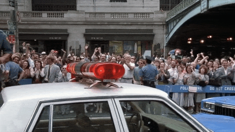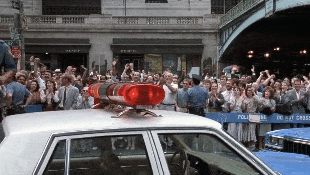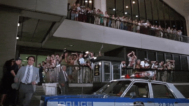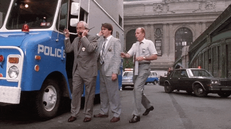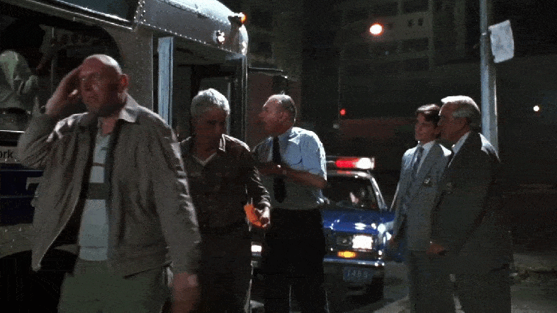 After the police meets one of “Chip’s” demands, a bearded hostage is released. (Note the library at the far end of 41st Street which was featured in another Murray film, Ghostbusters.)