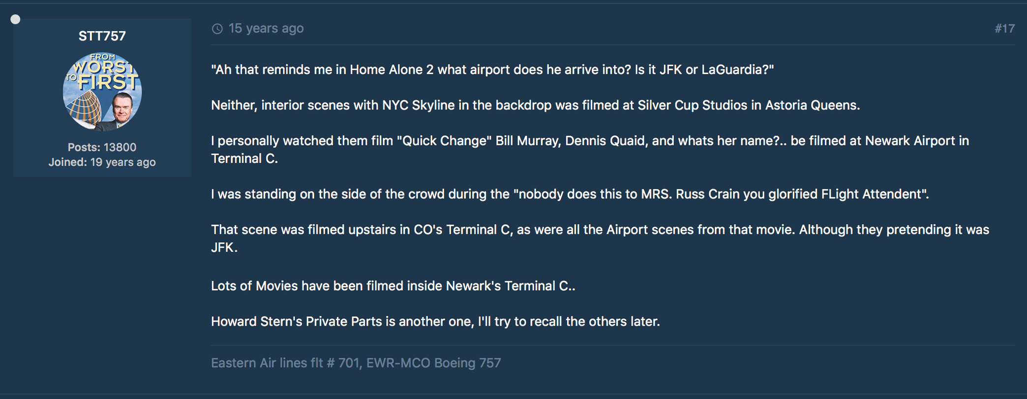 A screenshot of a 2004 forum on www.airline.net discussing airports in the movies, including some info about Quick Change.