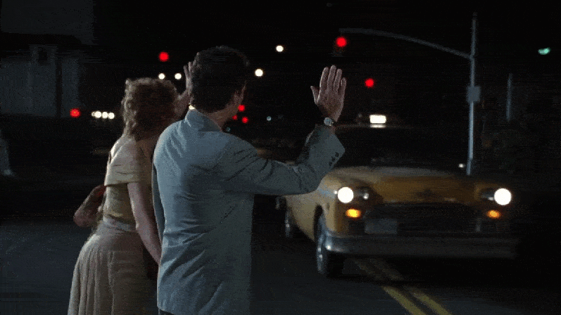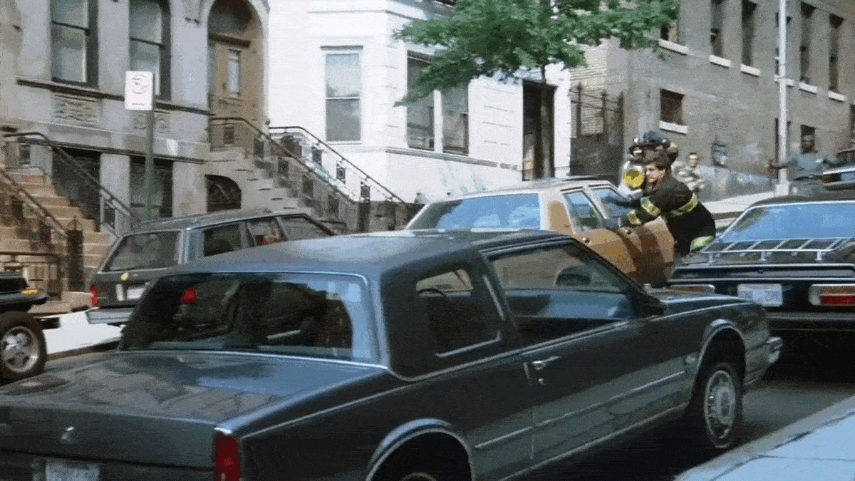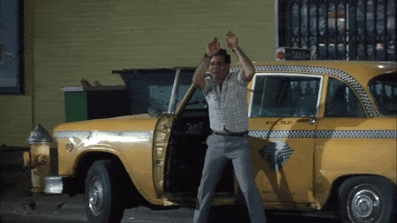 Loomis suddenly jumps out of the moving taxicab when he sees another available one on Jamaica Avenue, Queens.