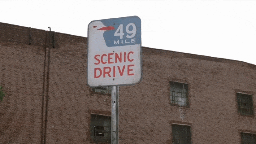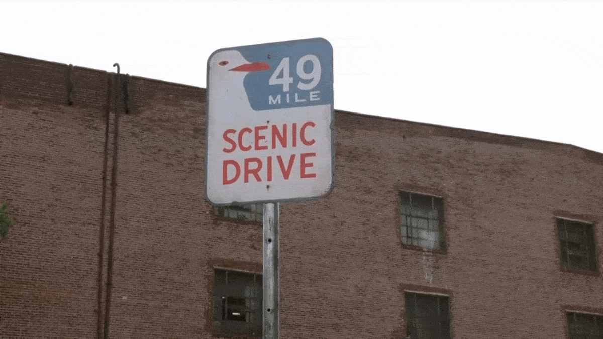 But when they look up at the sign in front of 106 Ferris Street, they’re disappointed to see it’s for a useless “49-mile scenic drive.”