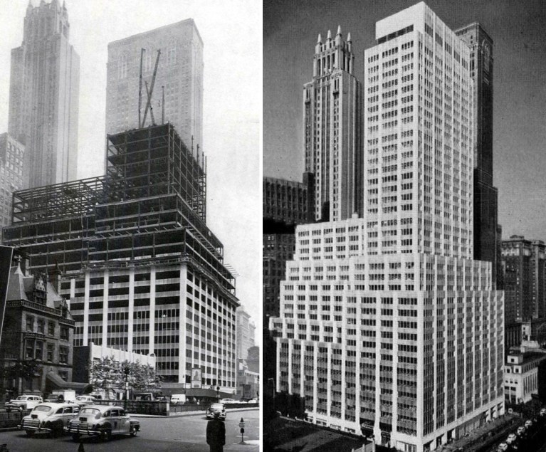 Looking north, the construction of 100 Park Avenue (left) and shortly after its opening in 1948 (right).