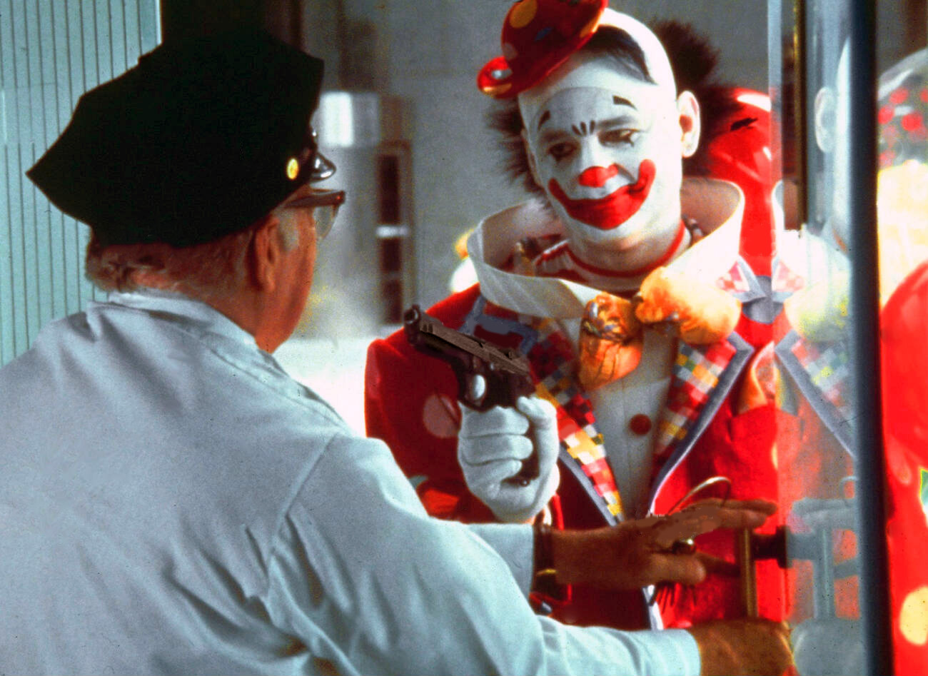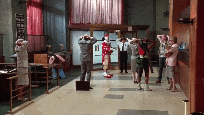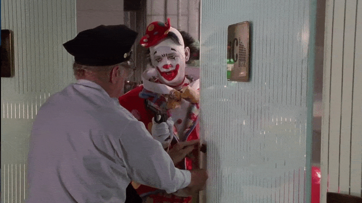 Inside, Grimm has a little trouble convincing the folks that a clown is truly robbing the bank, but eventually gets their attention when he fires his gun into the air.