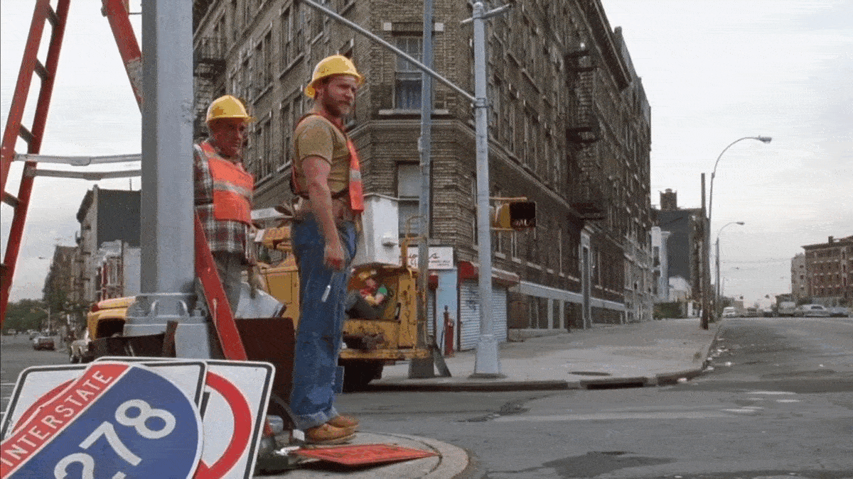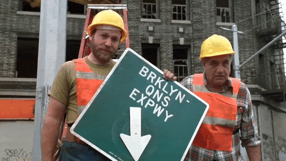 After realizing a couple maintenance men were working on the sign for the BQE, they backtrack to talk to them in front of 1182 West Farms Road.