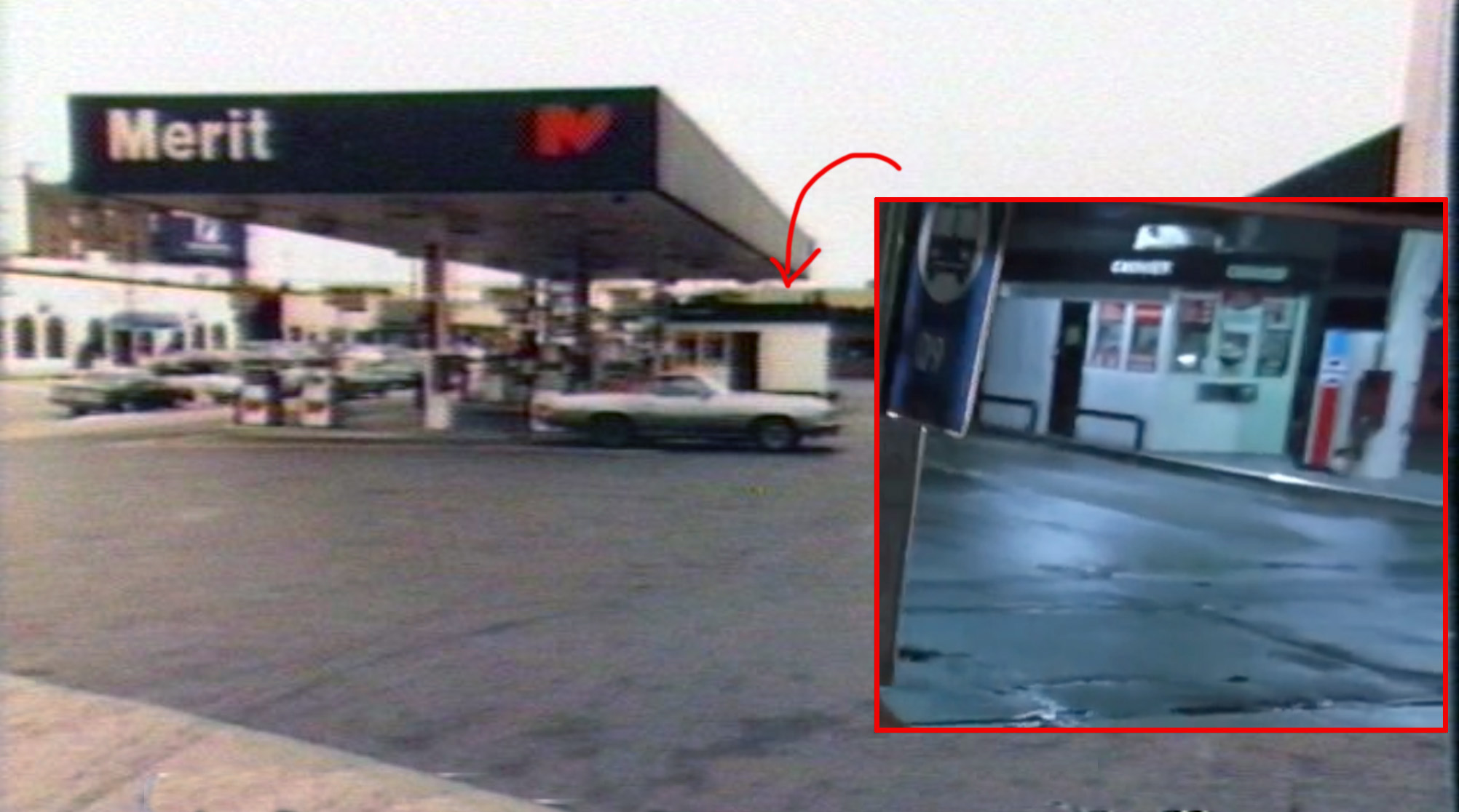 Things were looking pretty good for calling this location confirmed, but to help strengthen the case, I looked up a 1980s tax photo of the former Merit station. Even though the tax pic was taken from the reverse angle, I could tell that the cashier stand had the same door/window configuration as the one in the film, only flipped, since we were looking at the opposite side of the stand.