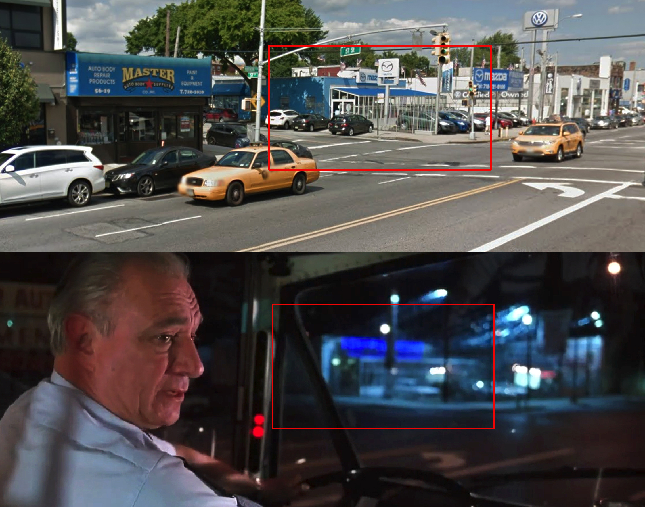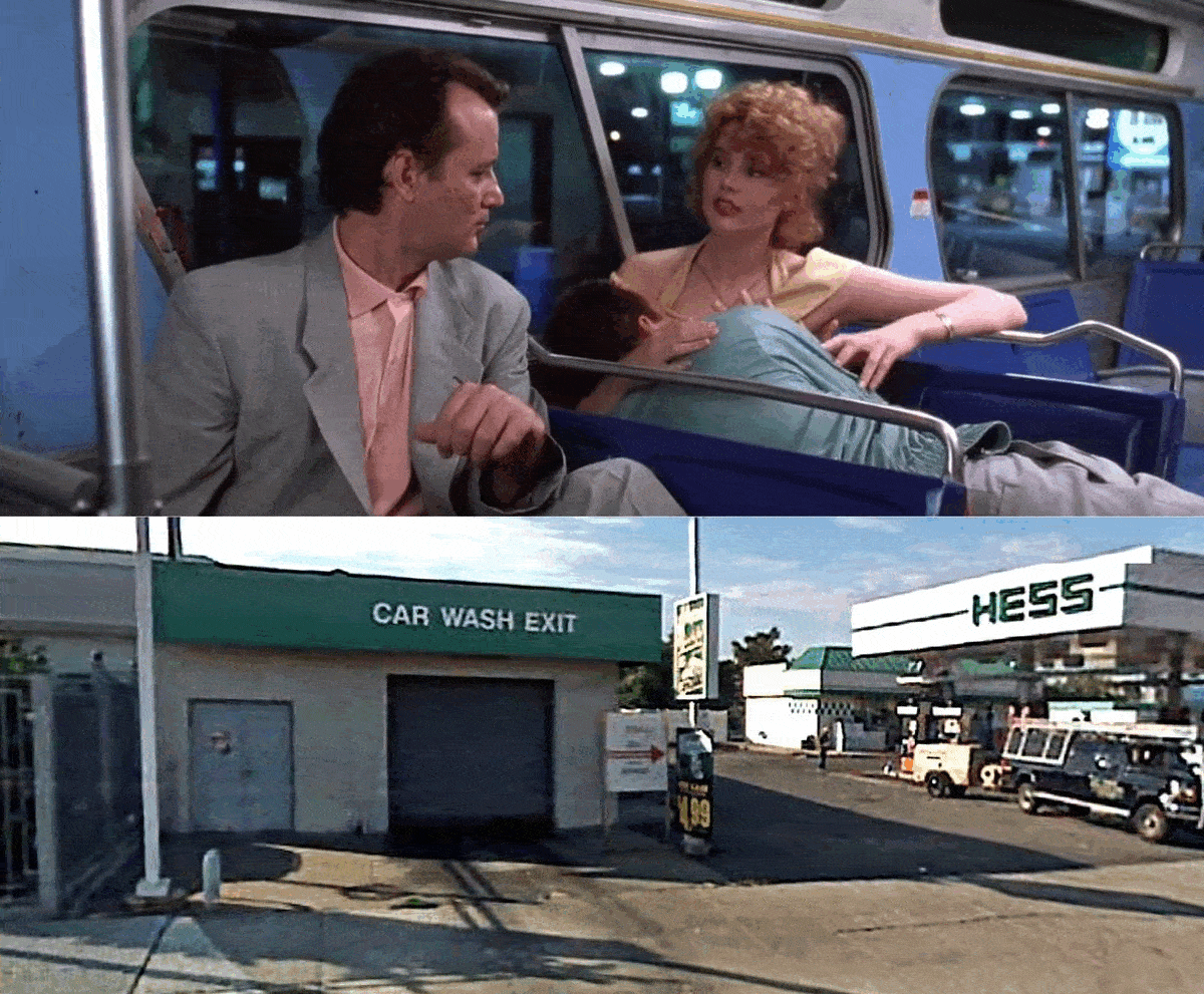 A still from the 1990 film (top) compared to a 2007 view of the Hess station at 39-04 Northern Blvd (bottom) with red boxes indicating matching entryways to the car wash.